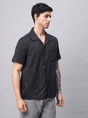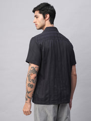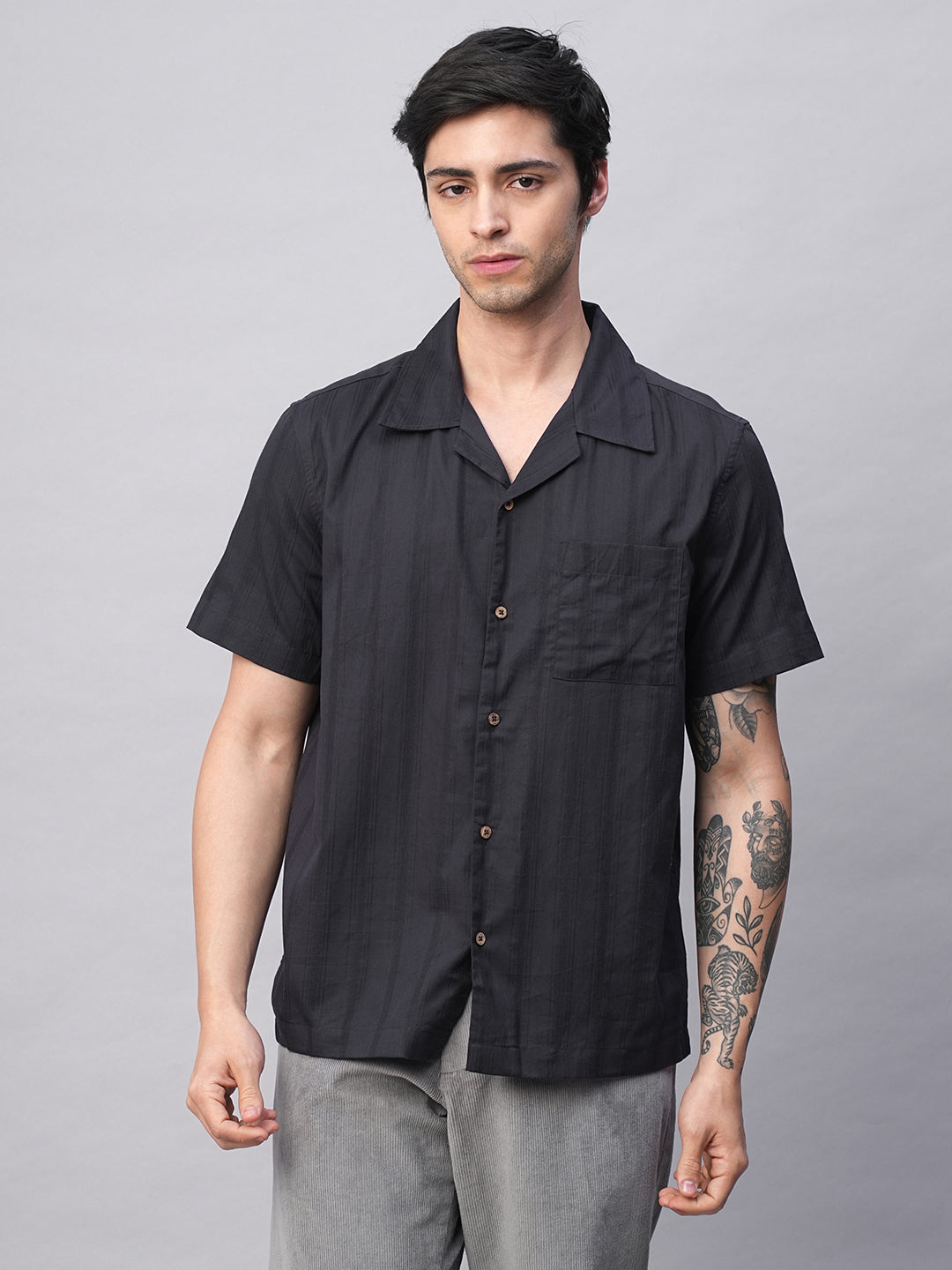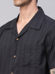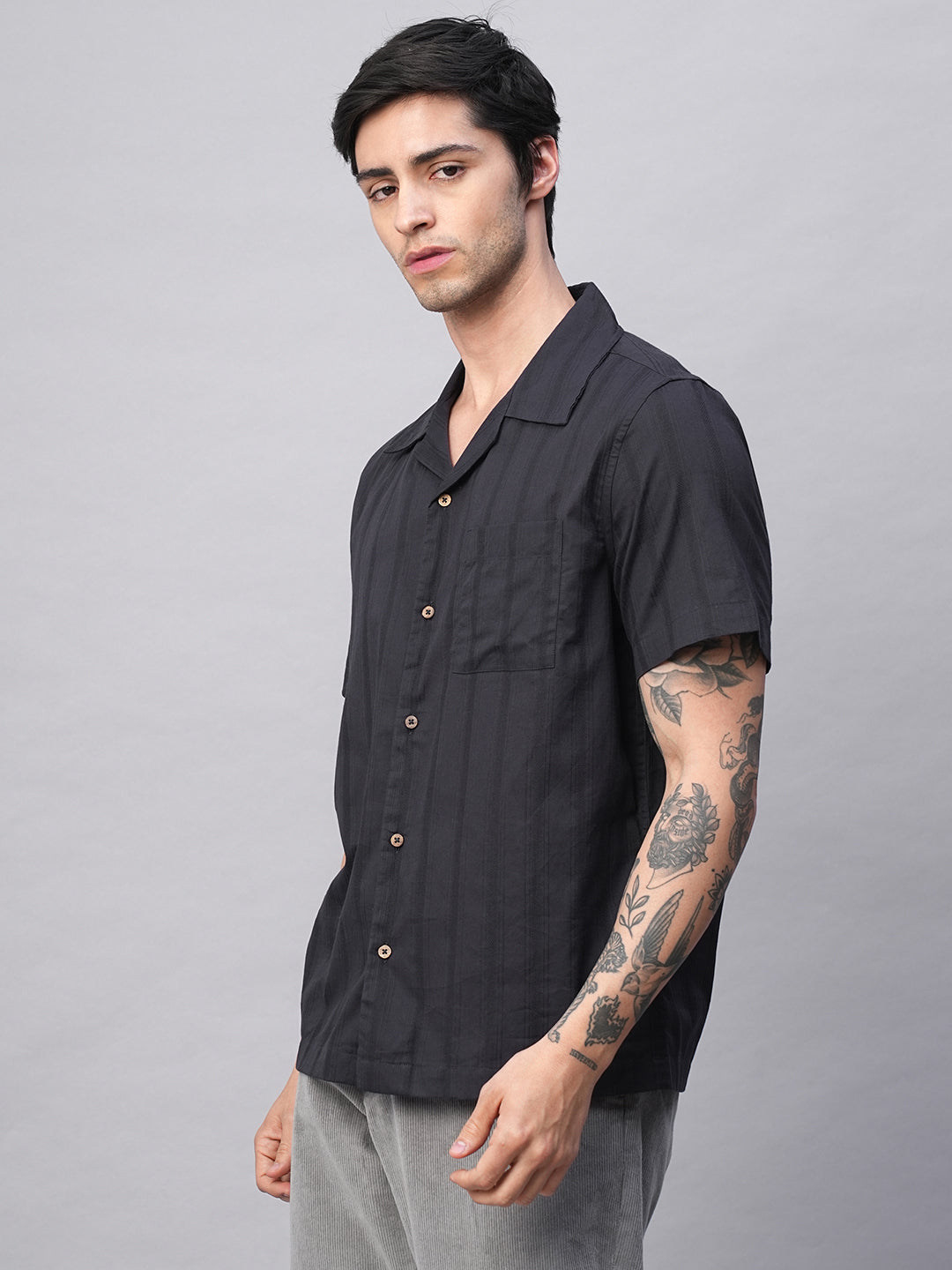 Men's Navy 100% Cotton Stripe Regular Fit Cuban Collar Shirt